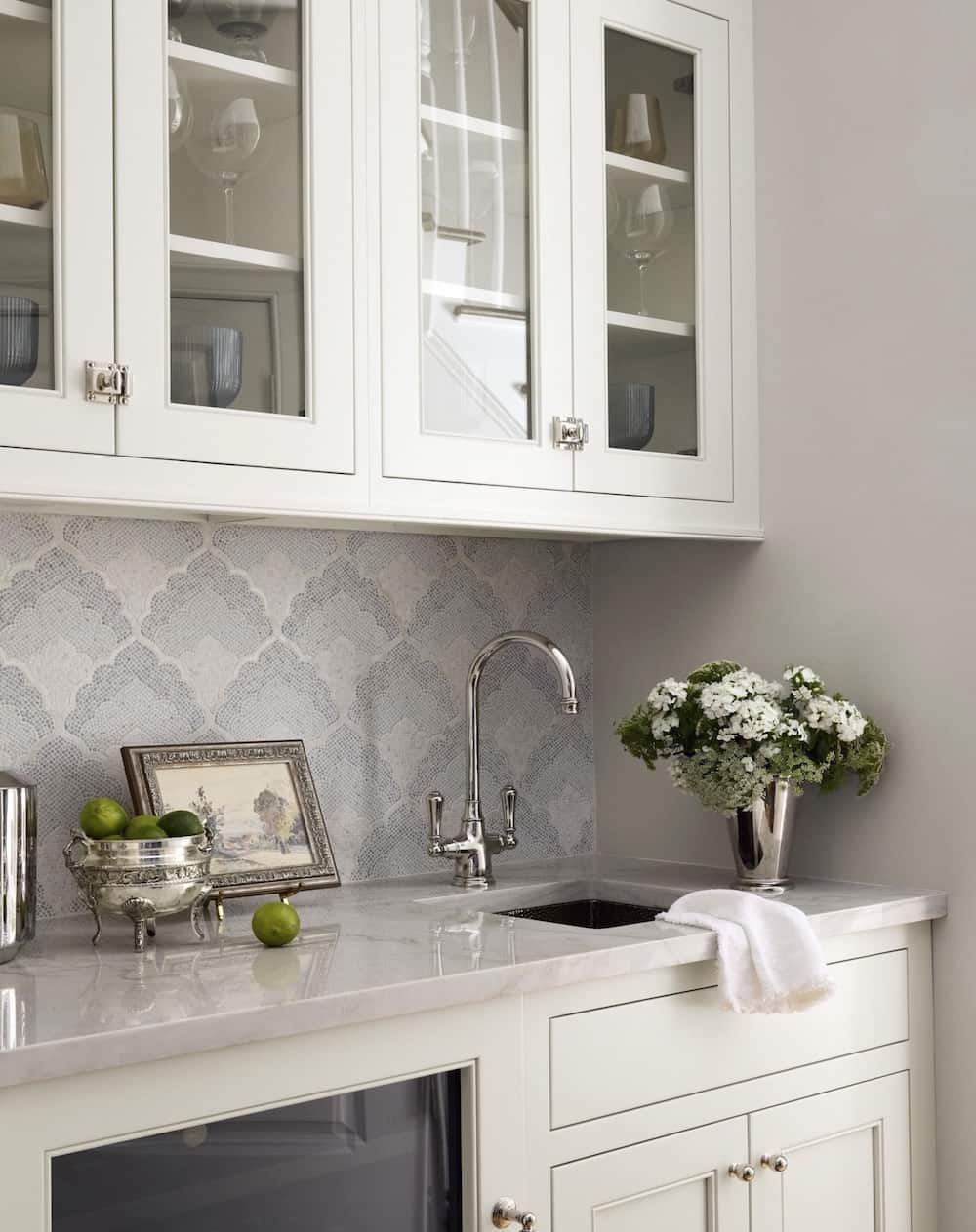 All cabinetry throughout the kitchen features elegant inset cabinet doors, showcasing precise craftsmanship and a clean, refined aesthetic. The space is finished with premium quartz countertops paired with a striking full-height backsplash that creates a seamless, upscale look while providing long-lasting durability and easy maintenance.
