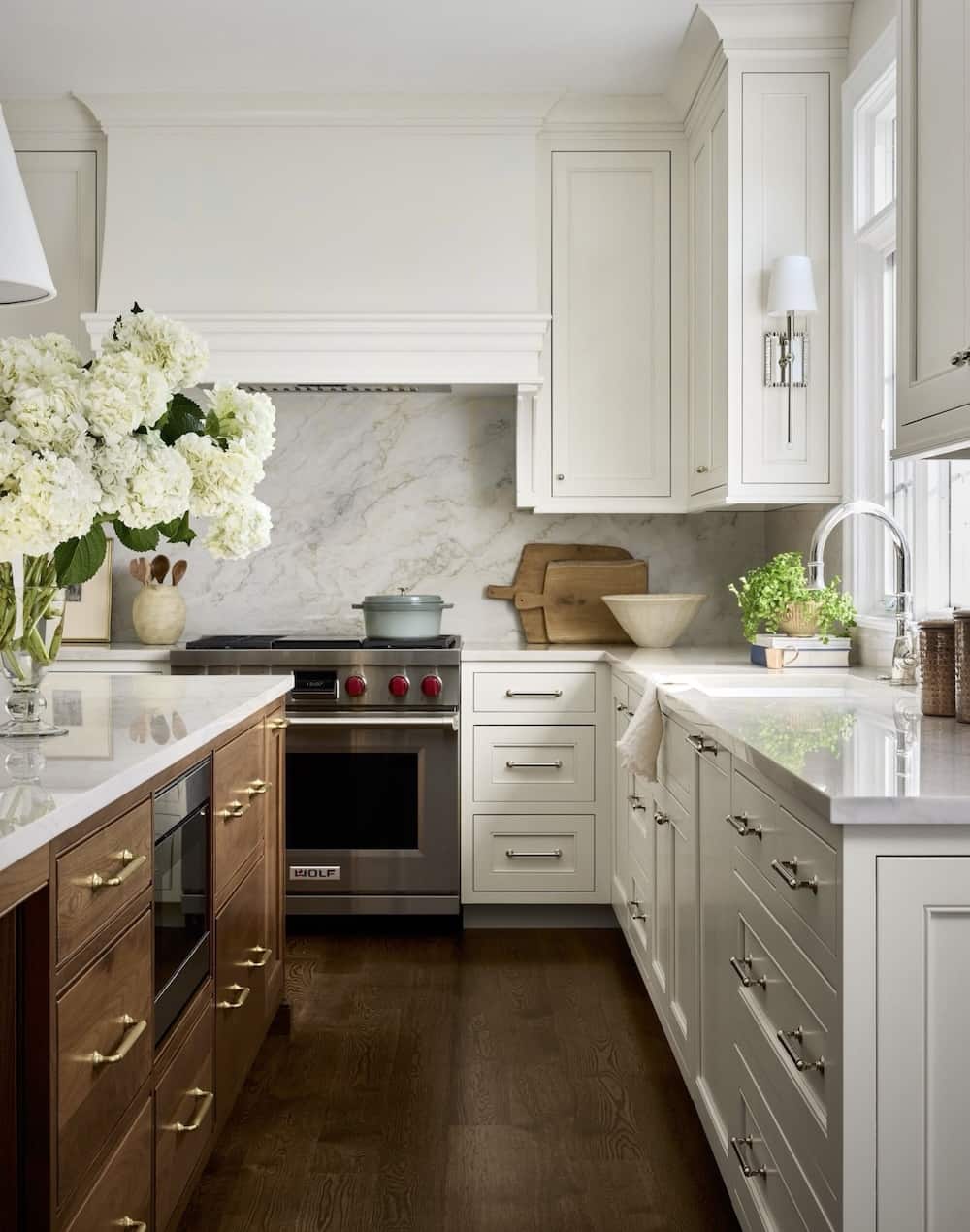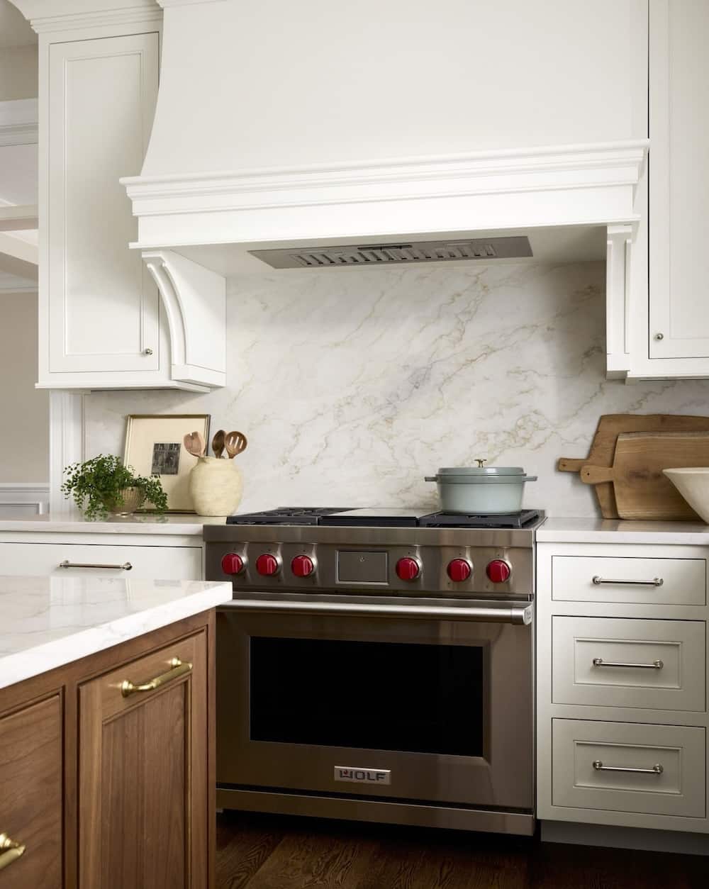 A standout feature of the kitchen is the stunning custom walnut island, bringing natural warmth, rich texture, and visual contrast to the space. The walnut island serves as a functional gathering area while elevating the overall design with handcrafted detail and premium materials.